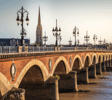 Modern buildings and offices on Liffey river in Dublin on a bright sunny day, bridge on the right is a famous Harp bridge.