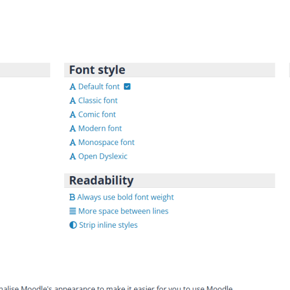 You can also add an Accessibility plugin – Moodle-local_accessibilitytool. This provides configuration options for the user to change colour scheme, font style, readability and text size across the whole site. This benefits all users, including those with disabilities.