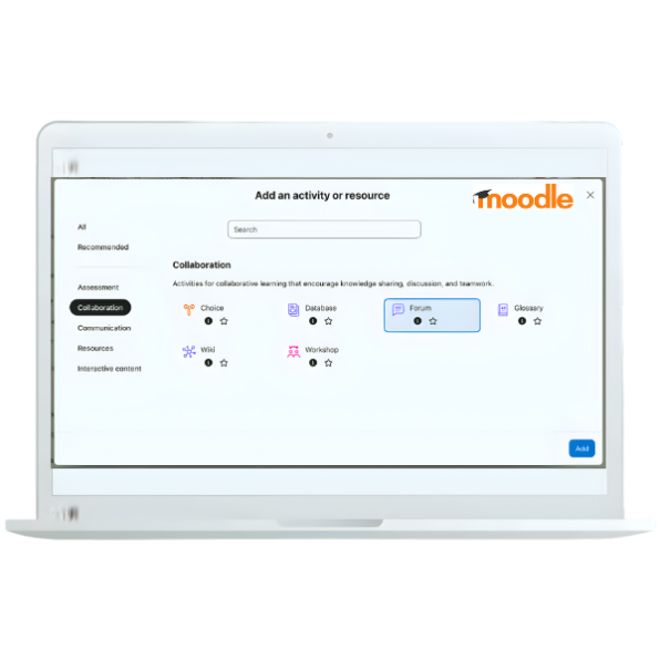 One of the standout improvements in 5.1 is the enhanced activity chooser. Activities are now grouped by educational purpose (such as assessment or collaboration), with clearer indicators showing whether an activity is gradable. This reduces friction when building courses and helps educators choose the right tools more confidently.
