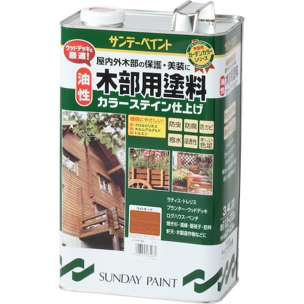- DIY・工具 > 塗料・塗装 > 【新品・14営業日以内発送】サンデーペイント 4906754264896 油性木部用塗料カラーステイン ライトオーク 3400M 油性木部カラーステイン SP油性木部用【沖縄離島販売】