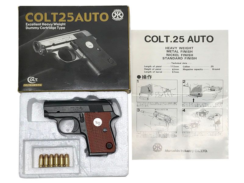 | 商品の特徴 | 商品の説明ポケットガンの代表格。ジュニア・コルト、コルト・ジュニア、コルト.25オートなど様々な名称で呼ばれる。金属表面のニブイ鉄色と手触りを再現したエクセレントヘヴィーウェイト・モデル、ダミーカートリッジ仕様。ダミーカートリッジが6発付属。●姉妹店の「エアガン.jp」から発送いたします。●すべての商品において、お値引きの対応は行っておりません。また、カスタム等の対応はしておりません。●18才未満のお客様には商品を販売できません。●当店は日本の銃刀法を遵守しています。取扱のエアソフトガンはすべて発射エネルギー0.98J以内で、ハンドガンは重要な外装部品が金属ではない製品です。●同様に取扱のモデルガンはすべてバレルやシリンダーにインサートがあります。●CO2ガスガン用マガジンを通常ガスガンに装填する行為は違法な改造にあたりますので、絶対におやめください。●商品写真は、以前に販売した品を撮影している場合がございます。商品の程度は商品名のランクを参考にしてださい。●商品について、試供品BB弾やマズルキャップ、ハガキ等の欠品についてはご容赦ください。●使用時はゴーグルを着用し、壊れやすい物の近くで使用しない等の注意事項を遵守してください。●トイガンはあくまで趣味の品です。害獣・害鳥等の撃退用や、護身用として使用しないでください。商品の情報カテゴリーゲーム・おもちゃ・グッズ>>>ミリタリー>>>トイガン>>>モデルガン>>>その他ブランドマルシン工業商品の状態目立った傷や汚れなし発送元の地域滋賀県 | ||