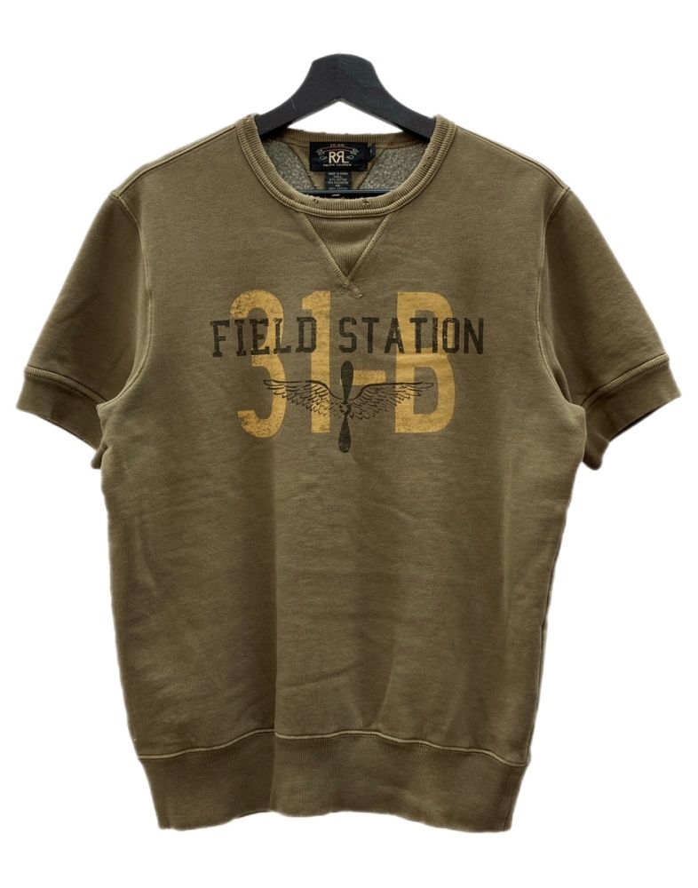 ダブルアールエル RRL S/S SWEATSHIRT 半袖 スウェットシャツ 31-B 両V 裏起毛 ダメージ加工 Ralph Lauren 茶 スウェット プリント ブラウン Sサイズ 104MT-2372