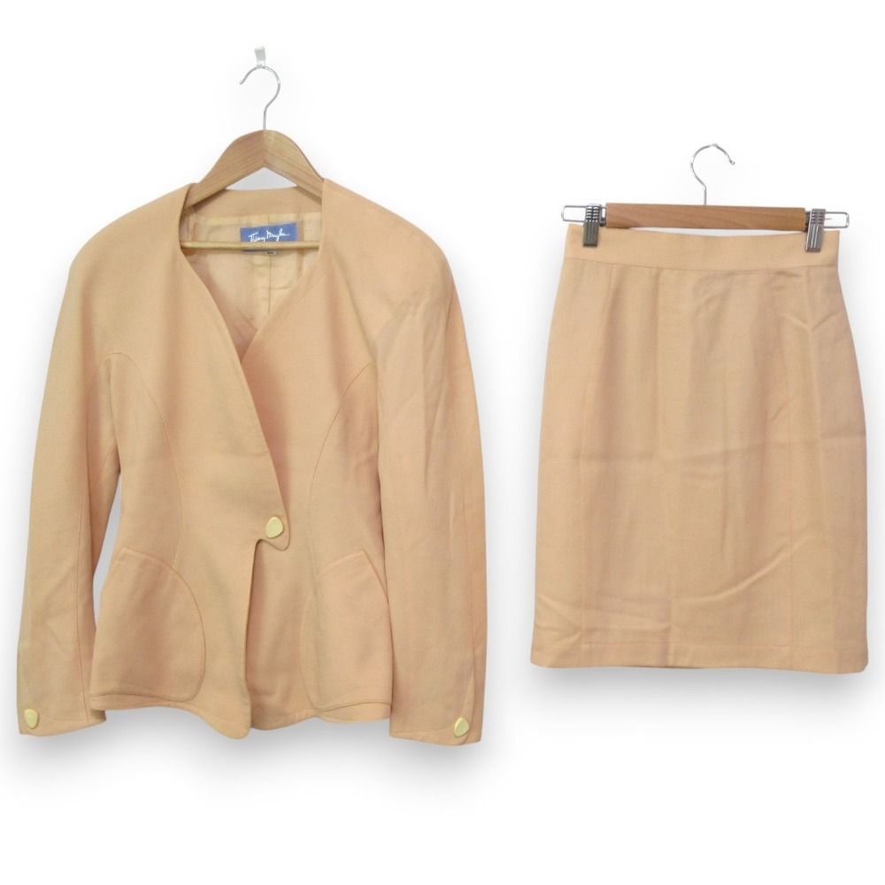 良品 Thierry Mugler ティエリーミュグレー ウール ノーカラージャケット+ひざ丈スカート セットアップ オレンジベージュ系 レディース 古着 USED